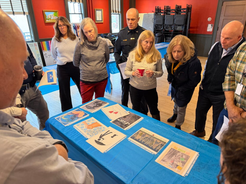A judging panel consisting of art teachers, school administrators, community members and public safety officials view the poster project entries. (Photo Courtesy Massachusetts Partnerships for Youth)